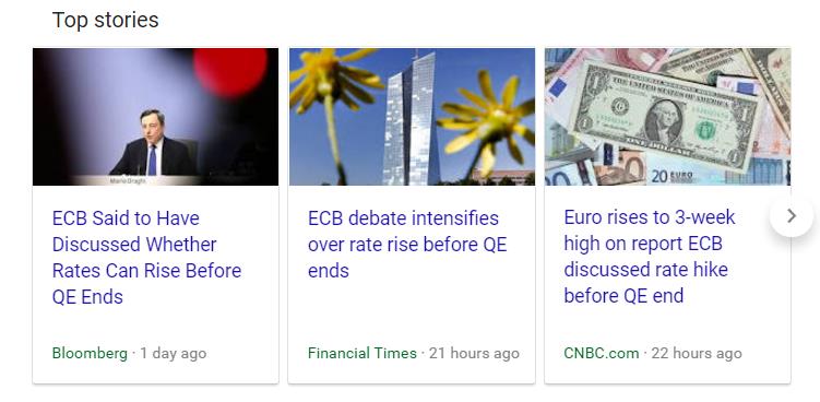 Frankly, we didn’t see any of it. Yet a Friday afternoon web search merely to get back to the ECB main page to access the video and transcript yielded the news story links (not live in the graphic) to the left. This is where the ‘fake news’ aspect comes into what was in fact a very ‘steady as she goes’ ECB press conference in spite of the tectonic shift on the most aggressive accommodation tools coming off the table for now. The Bloomberg article leads with, “European Central Bank policy makers considered the question of whether interest rates could rise before their bond-buying program comes to an end, according to people familiar with the matter.”